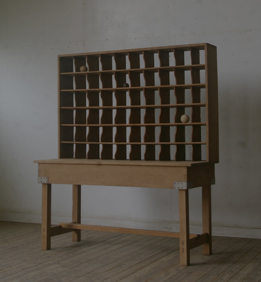 とても存在感のあるアンティーク郵便局の仕分け棚付テーブルです。