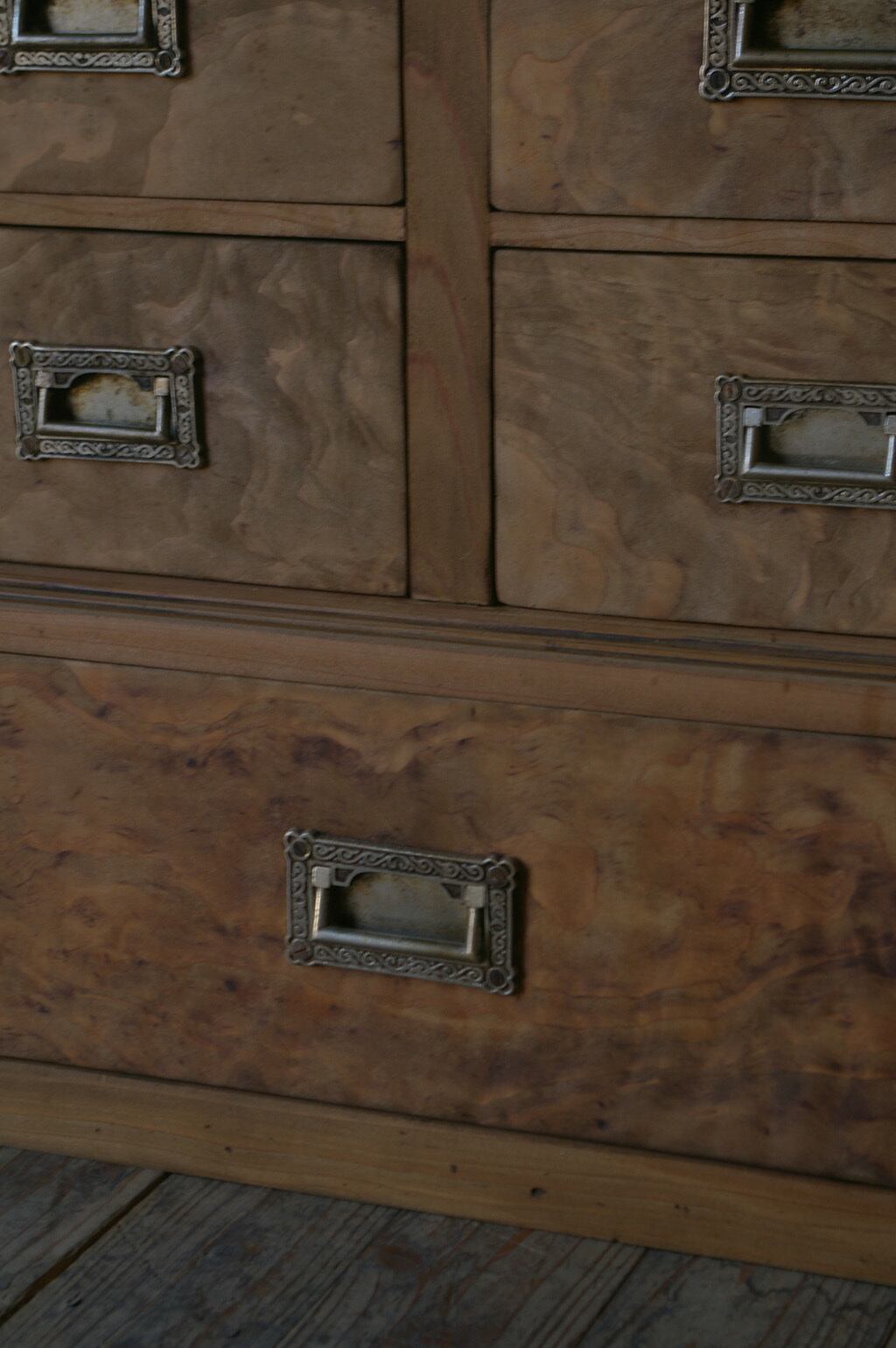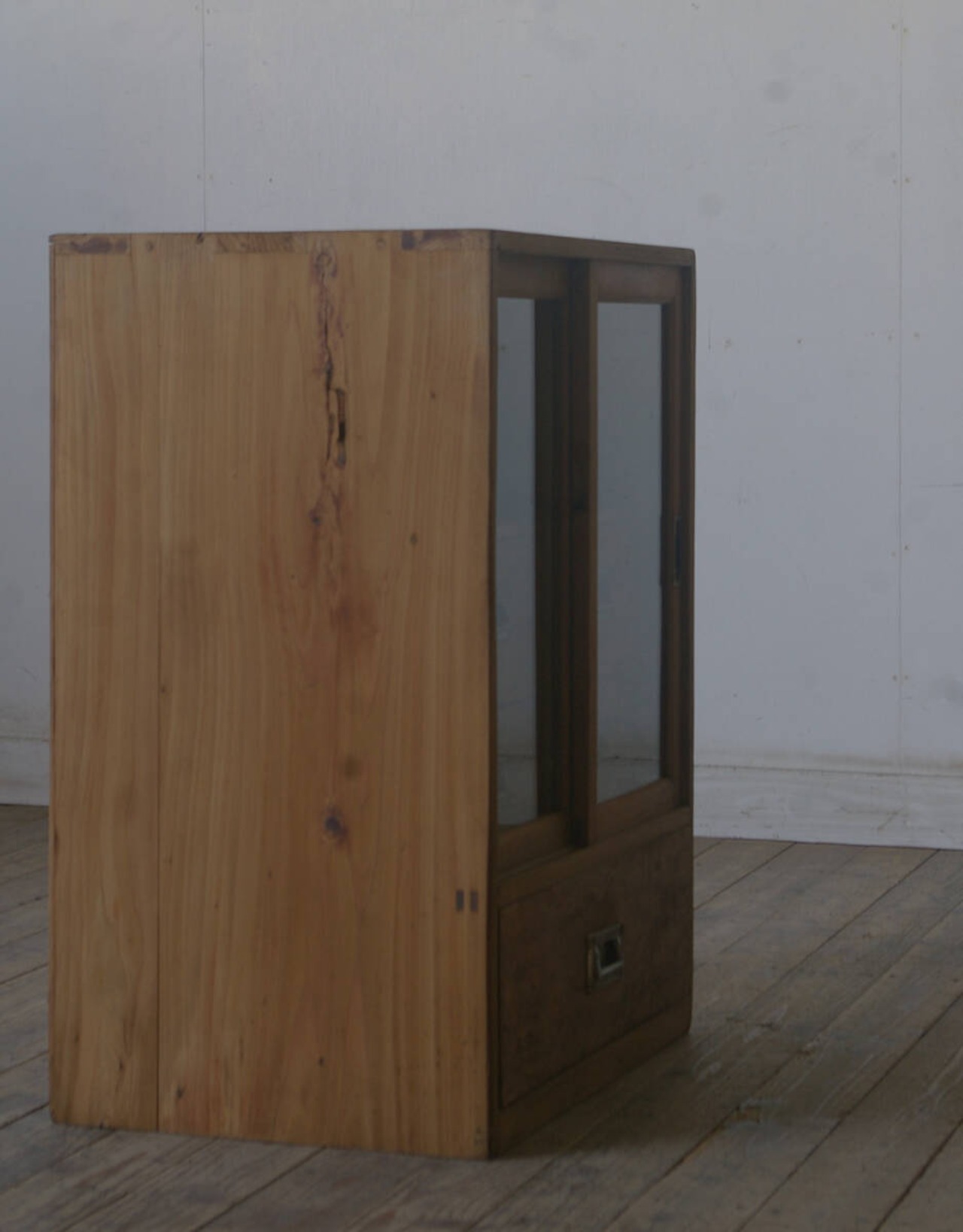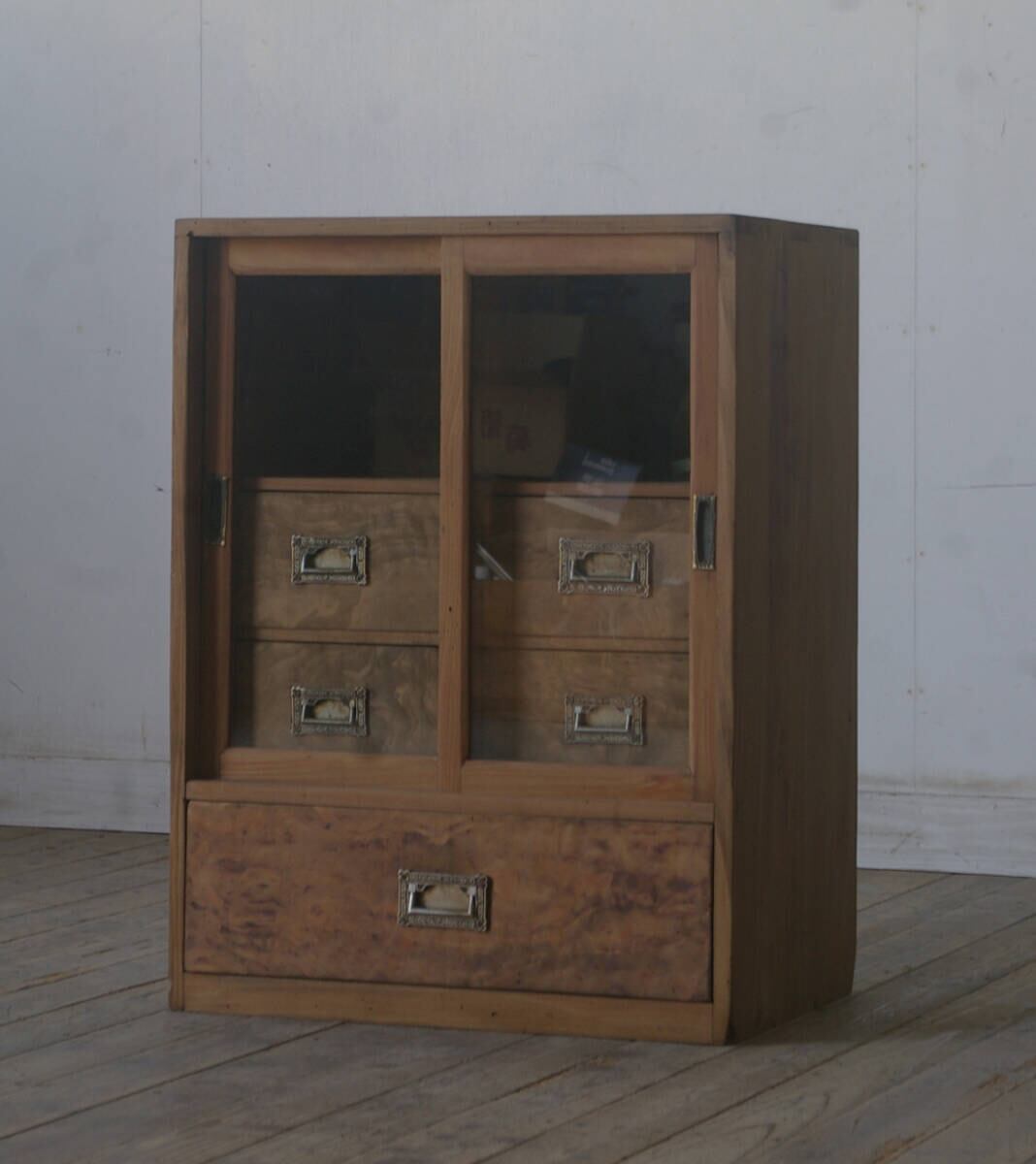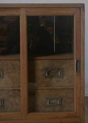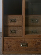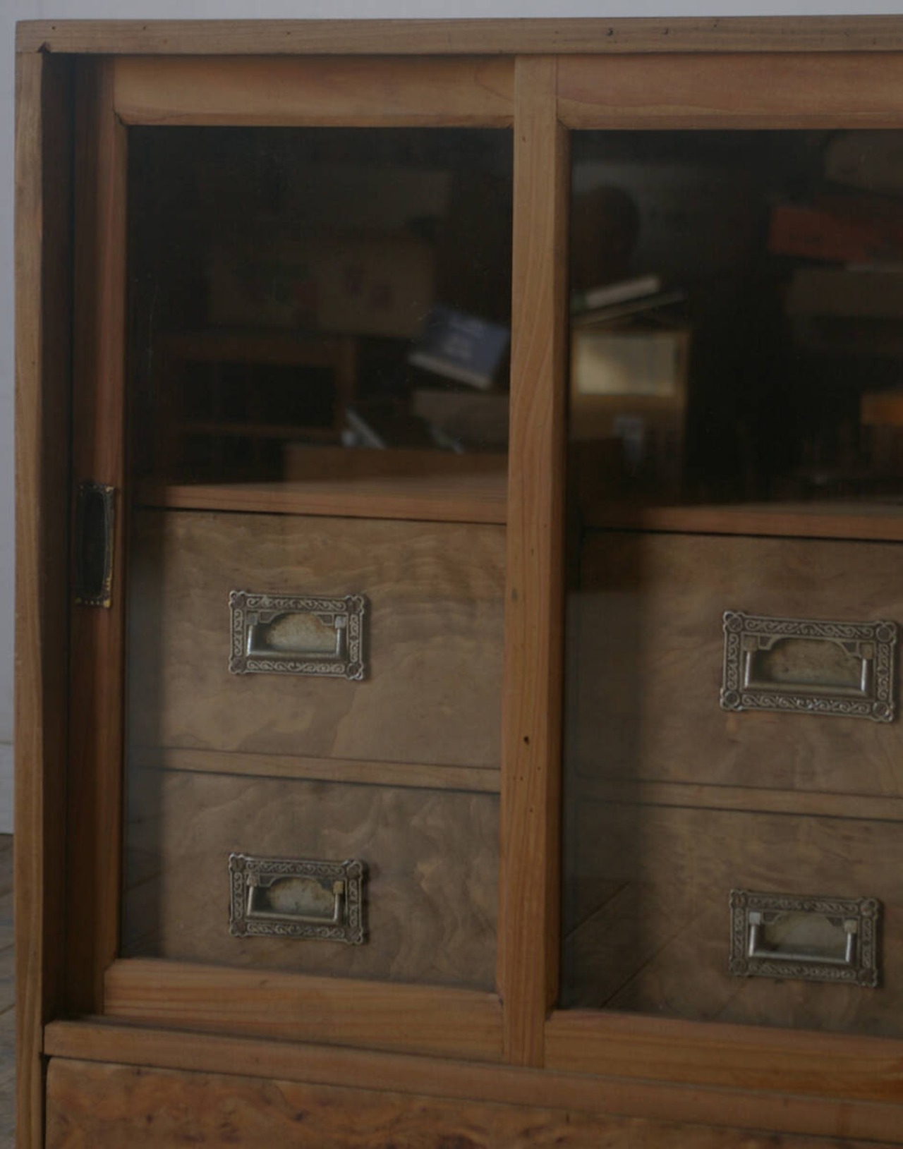 2枚のガラス戸と5杯の引き出し、古い無垢材の綺麗な木目がとても雰囲気の良いアンティーク引き出し5杯ガラス戸棚です。