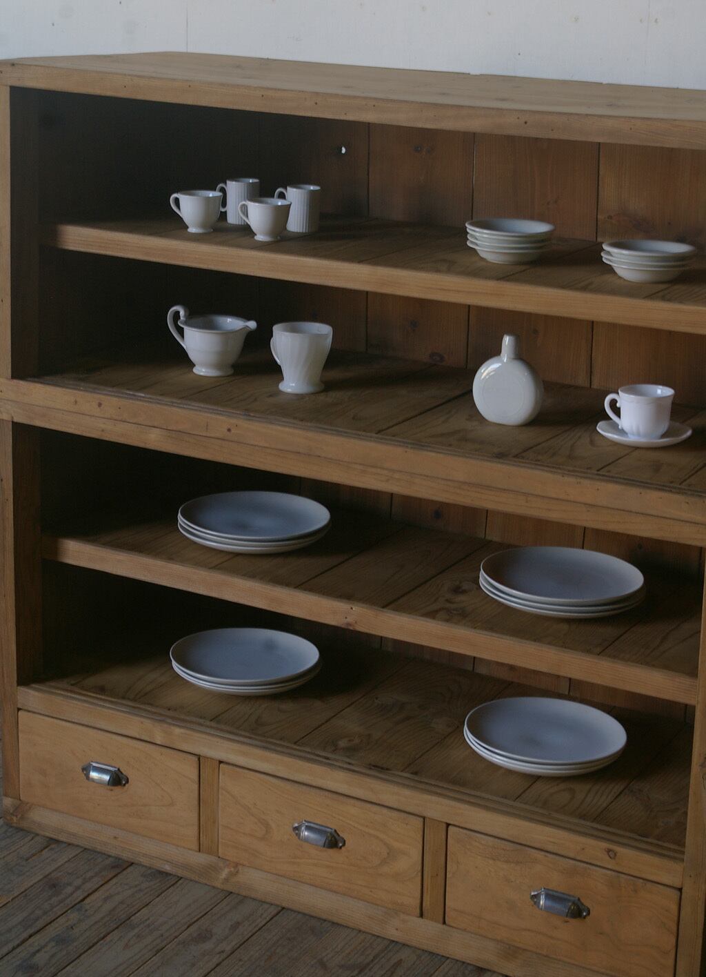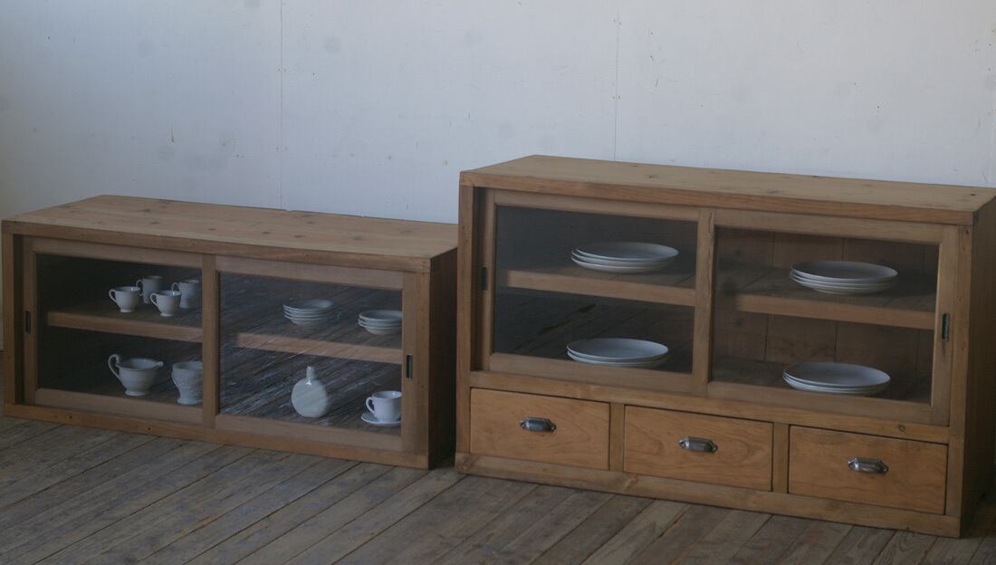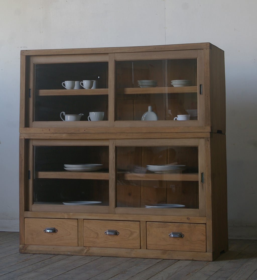 収納力もあり、4枚のガラス戸と3杯の引き出し、古い無垢材の綺麗な木目がとても雰囲気の良いアンティーク重ねガラス戸棚です。