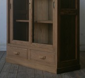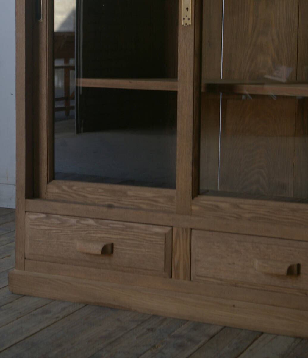 大きな2枚のガラス戸と2杯の引き出し、古い無垢材の綺麗な木目がとても雰囲気の良いアンティークガラス戸棚です。