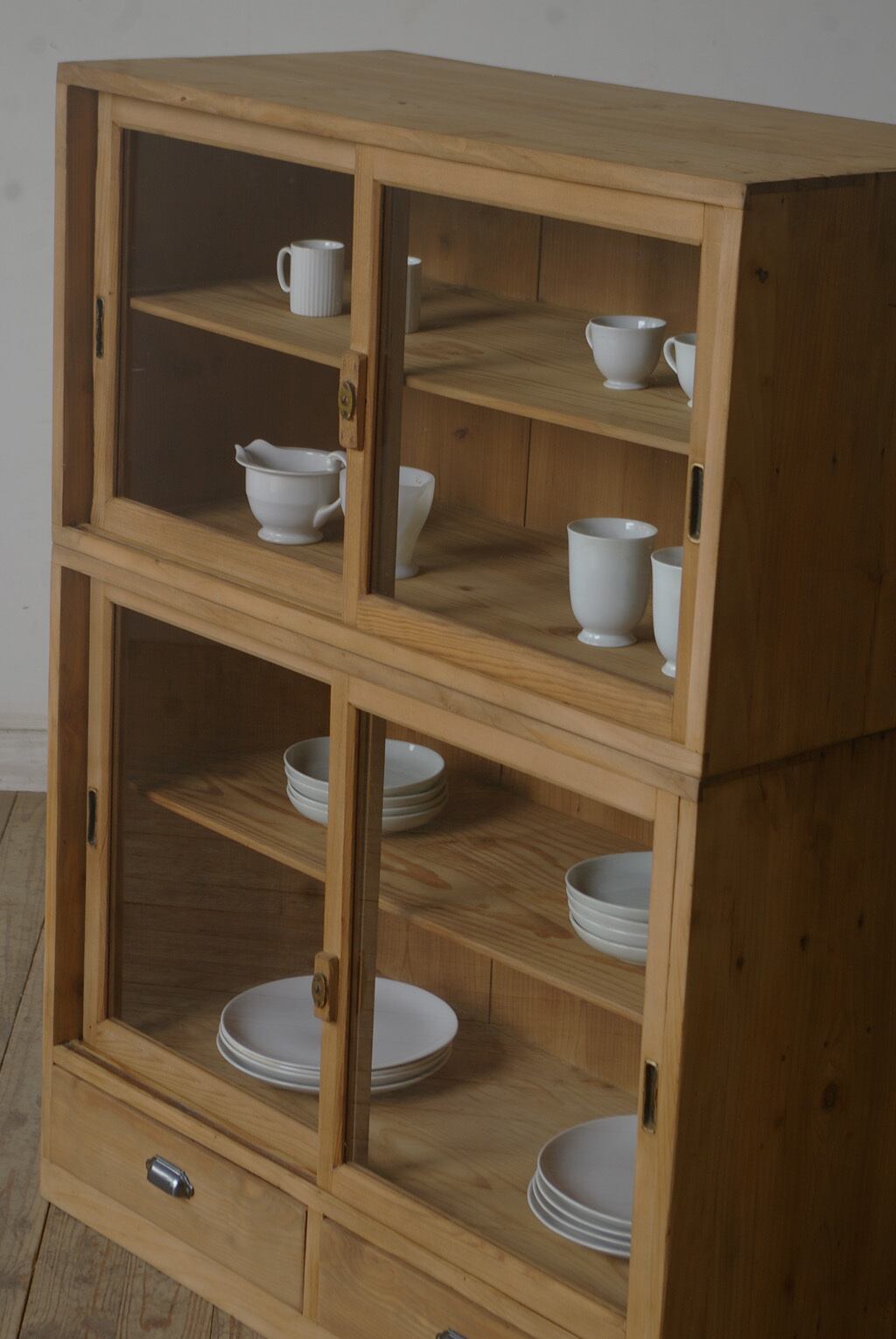 4枚のガラス戸と2杯の引き出し、古い無垢材の綺麗な木目がとても雰囲気の良いアンティーク重ねガラス戸棚です。