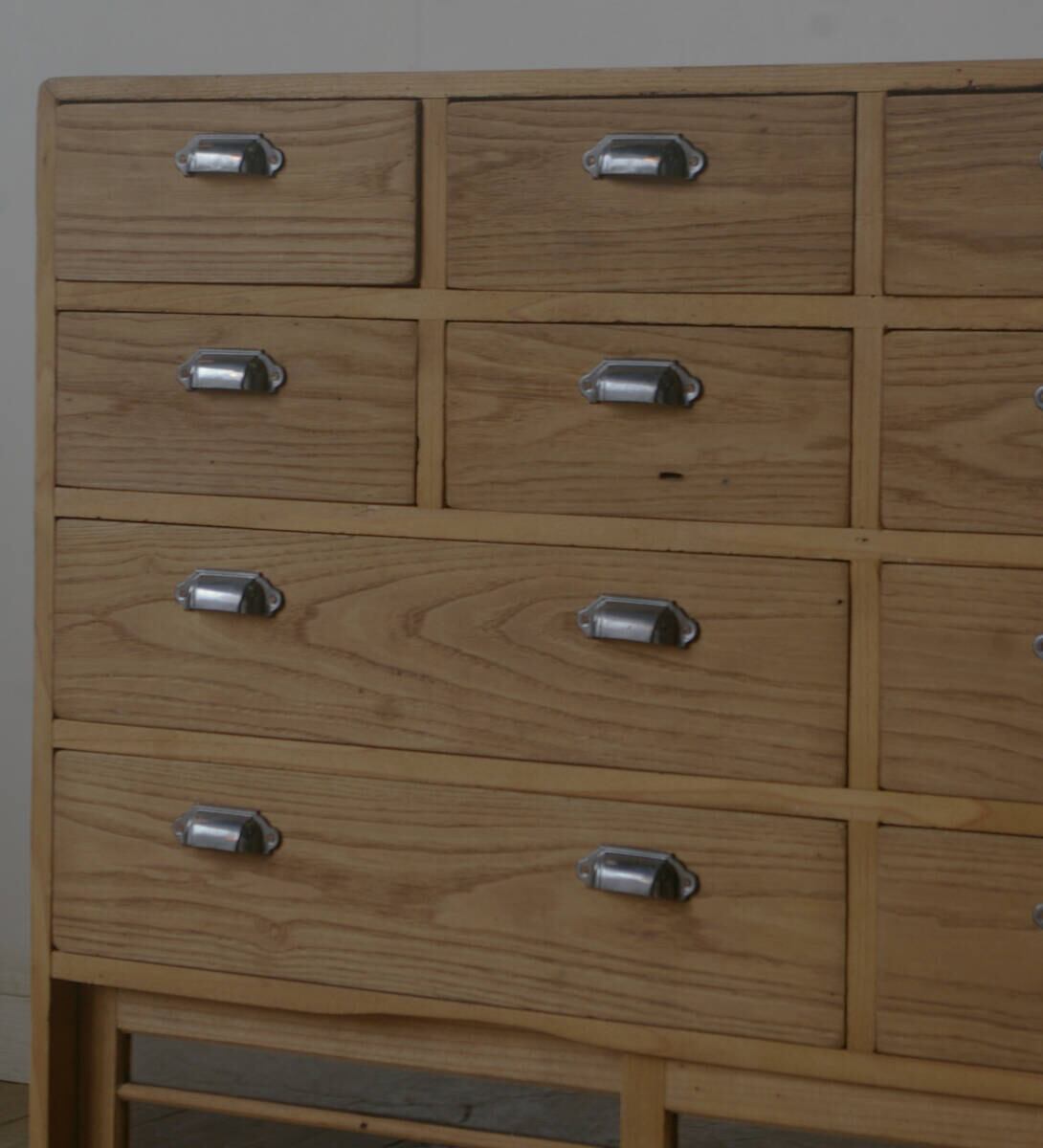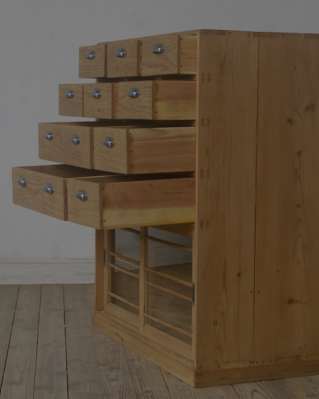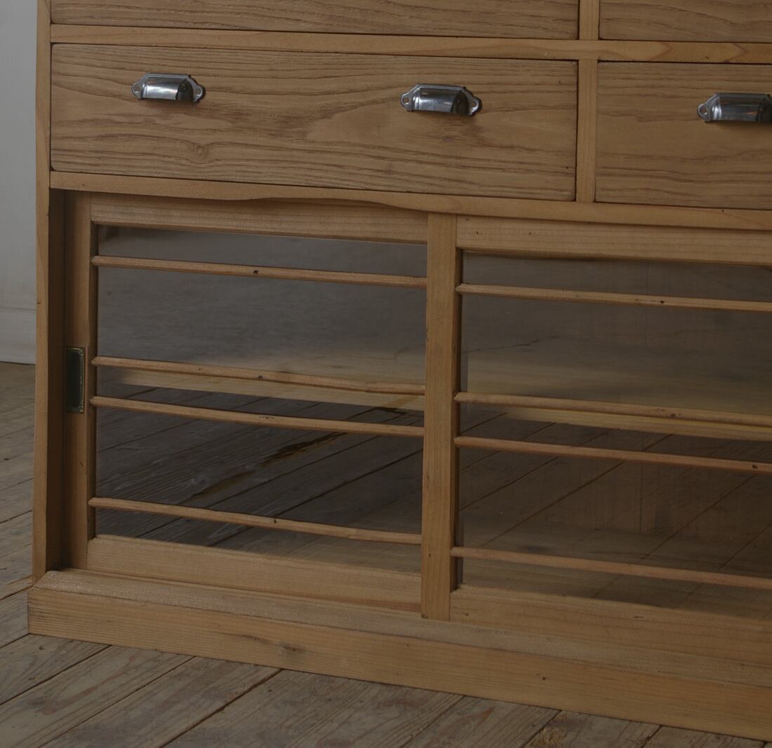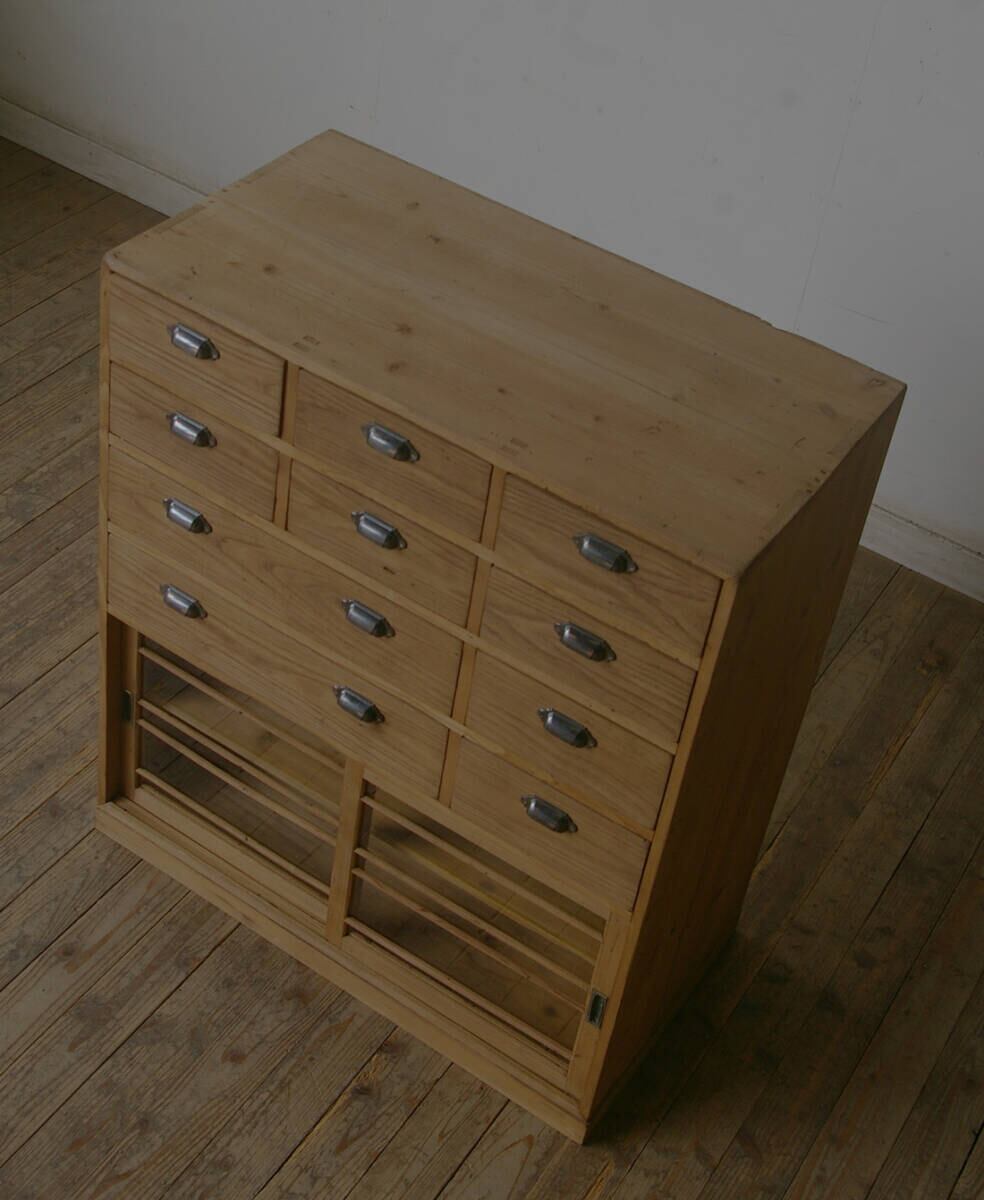 珍しいデザインで収納力もあり、大小10杯の引き出しと小さな2枚のガラス戸、古い無垢材の綺麗な木目がとても雰囲気の良いアンティークチェストです。