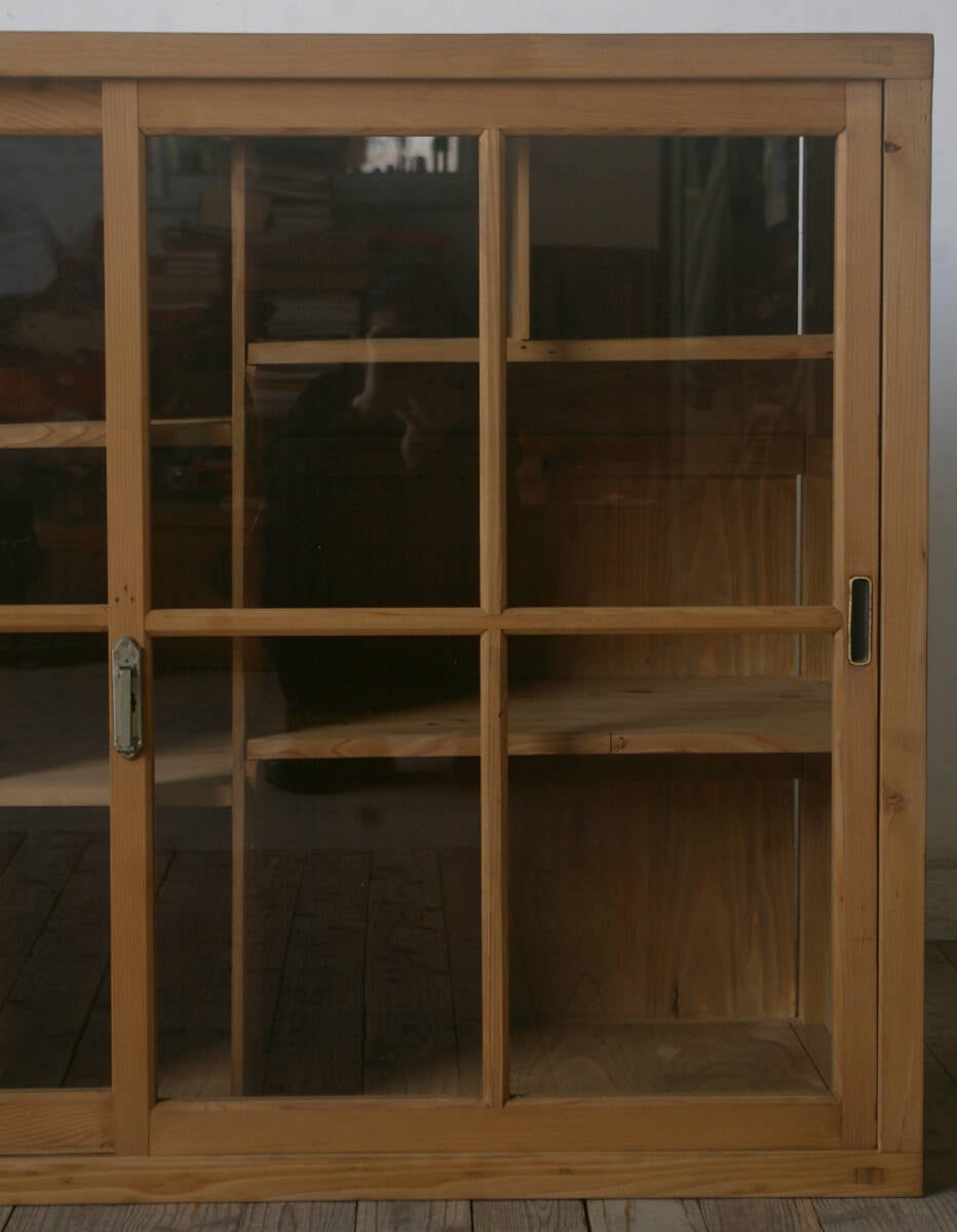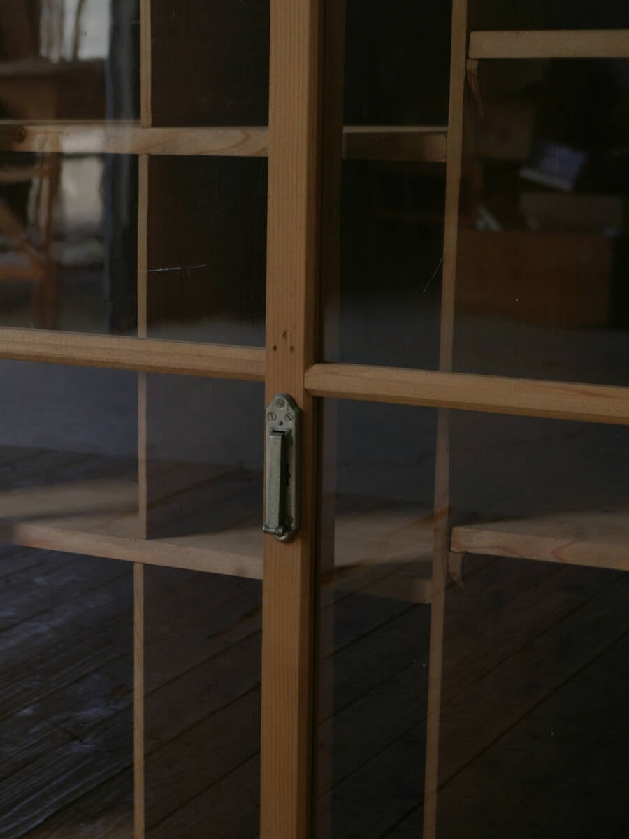 古い無垢材の綺麗な木目がとても雰囲気の良いアンティークガラス戸棚です。