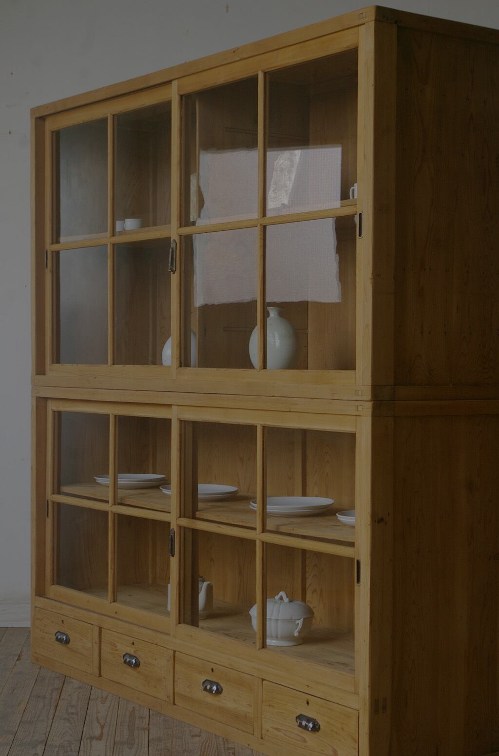 古い無垢材の綺麗な木目がとても雰囲気の良いアンティーク重ねガラス戸棚です。