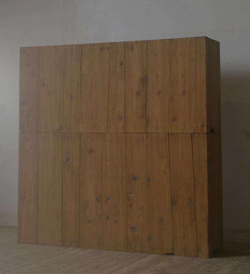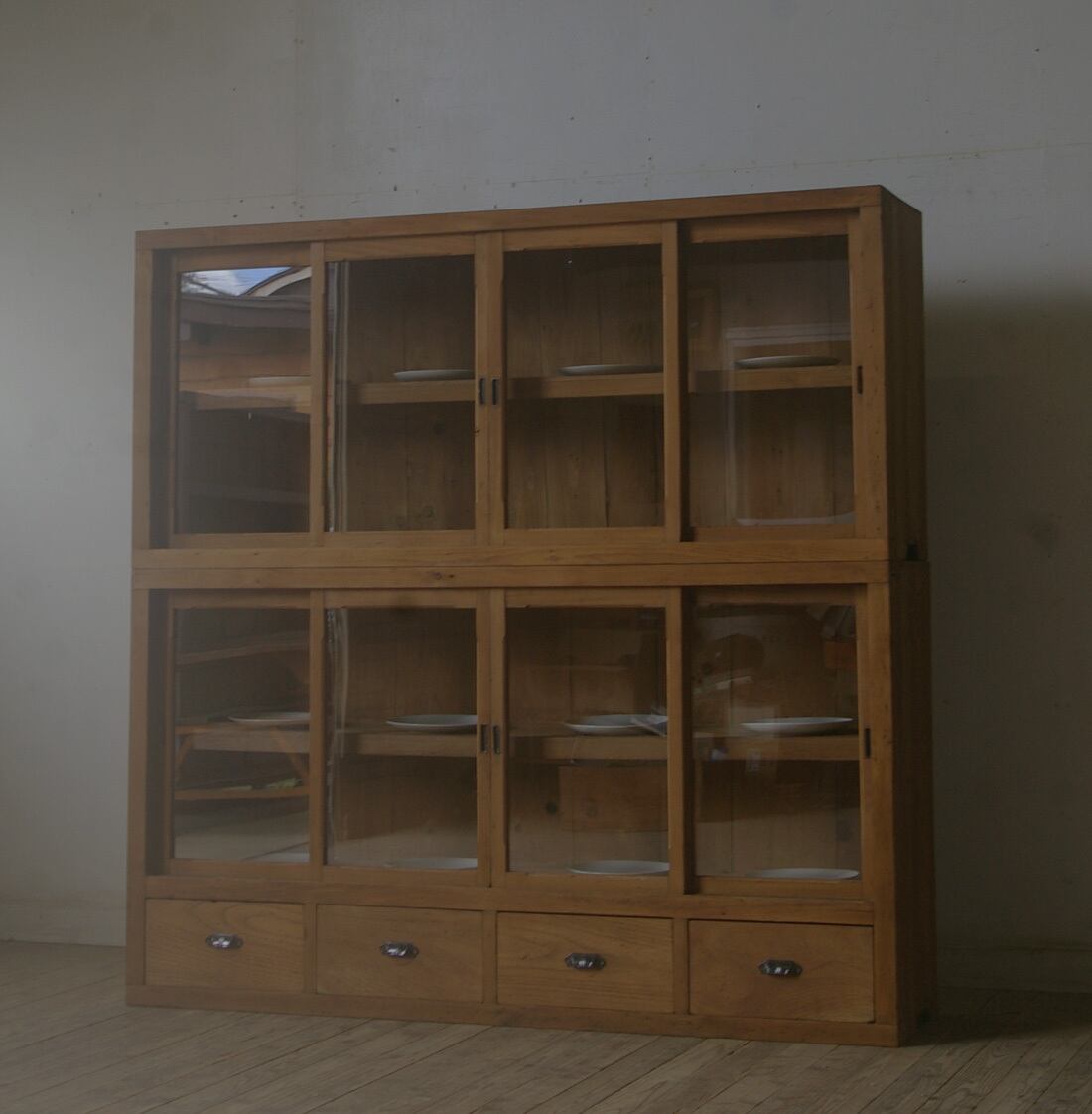 古い無垢材の綺麗な木目がとても雰囲気の良いアンティーク重ね8枚ガラス戸棚です。
