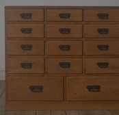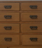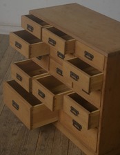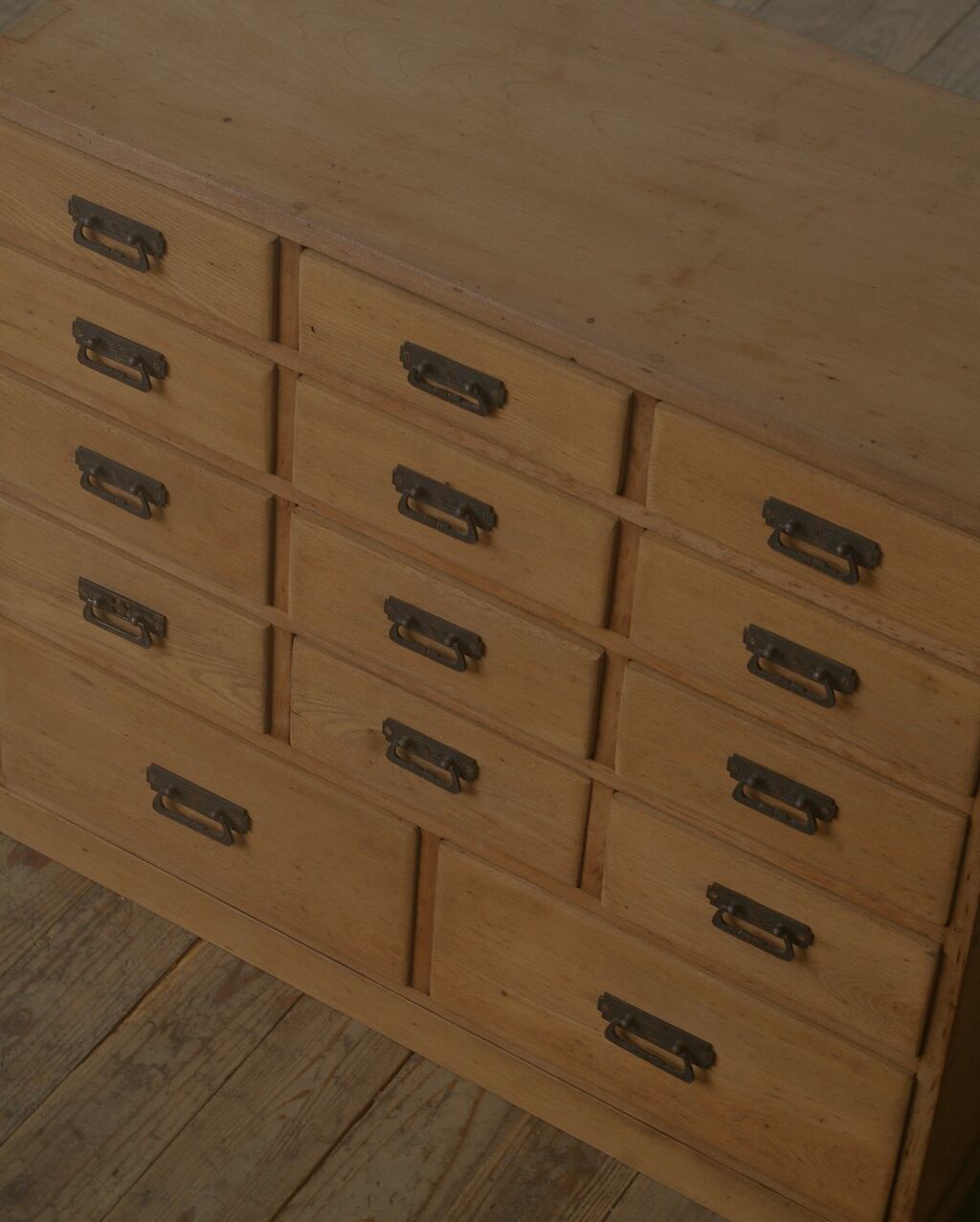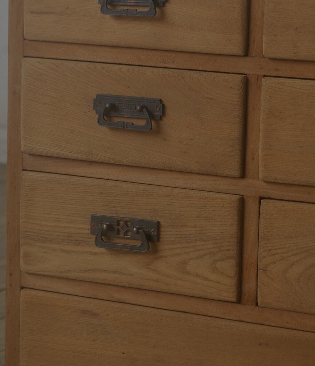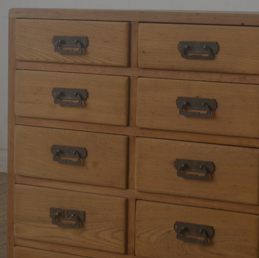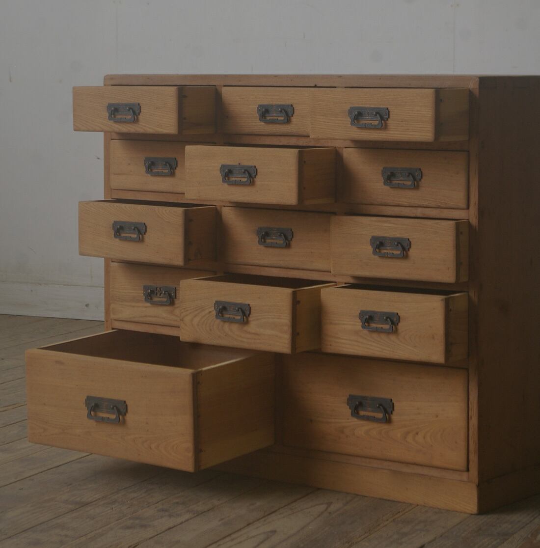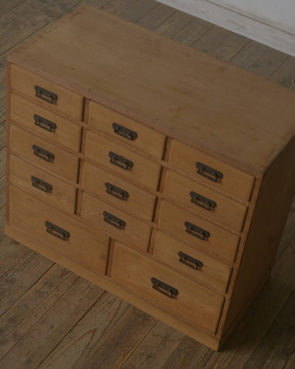 14杯の引き出しと古い無垢材の綺麗な木目がとても雰囲気の良いアンティークチェストです。