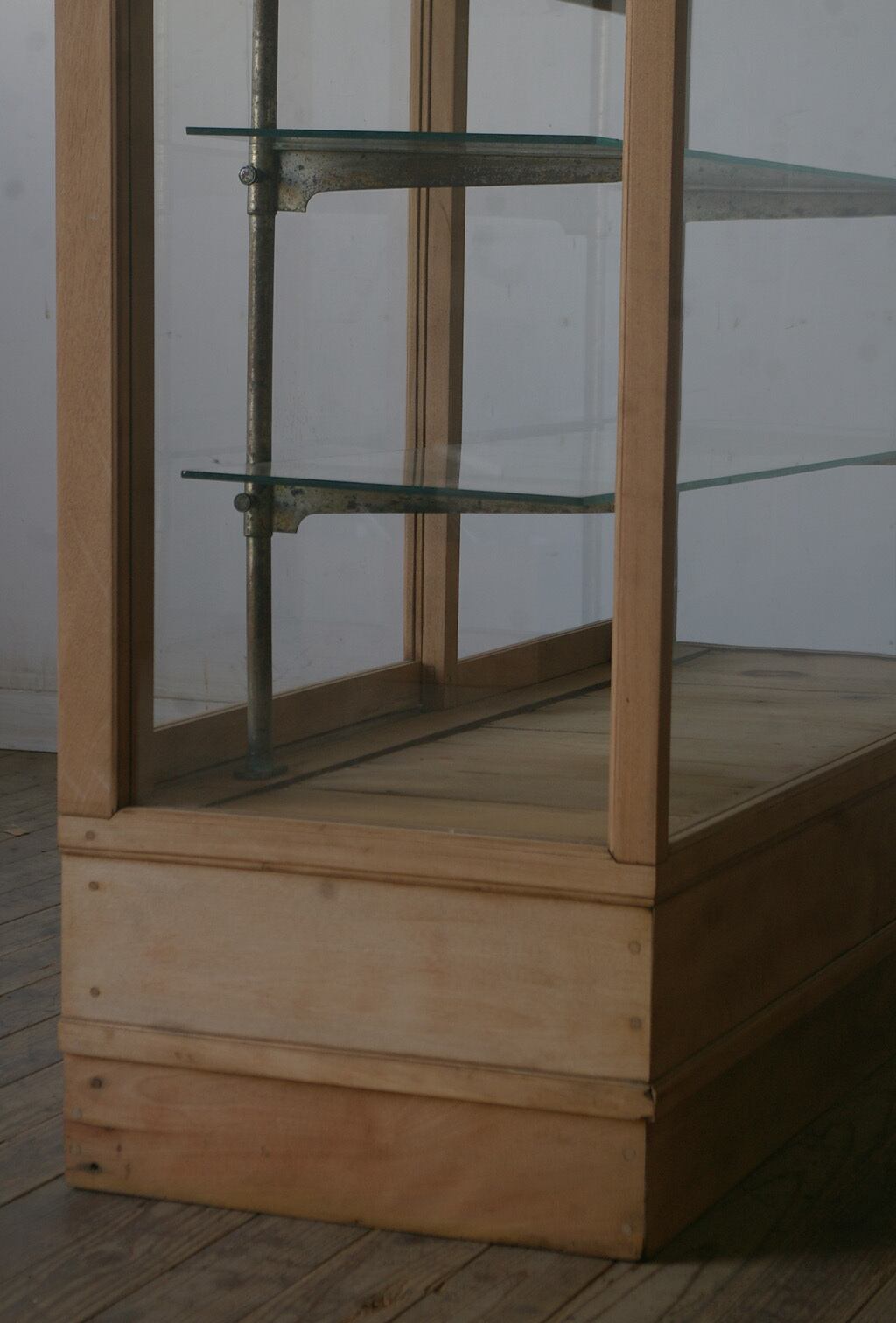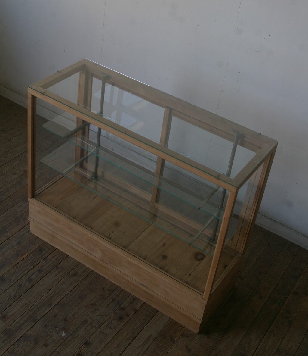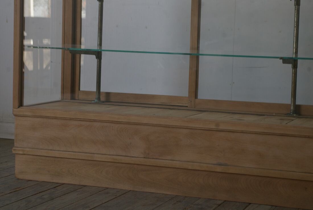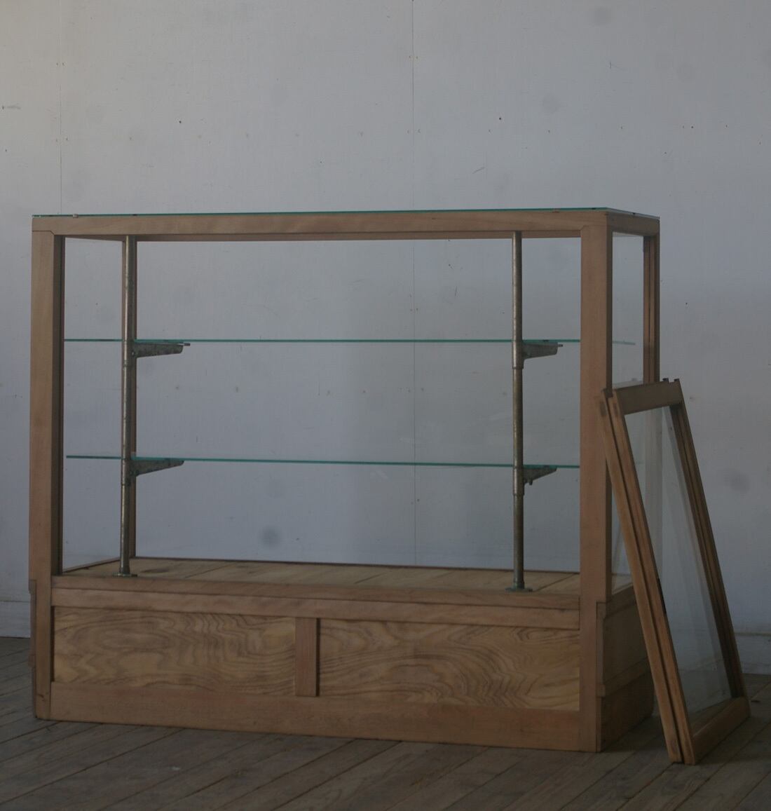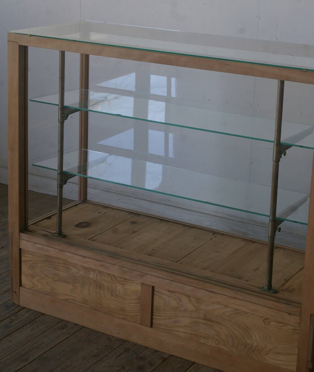 古い木枠の綺麗な木目がとても雰囲気の良いアンティーク5面ガラスショーケースです。