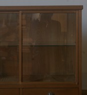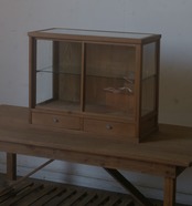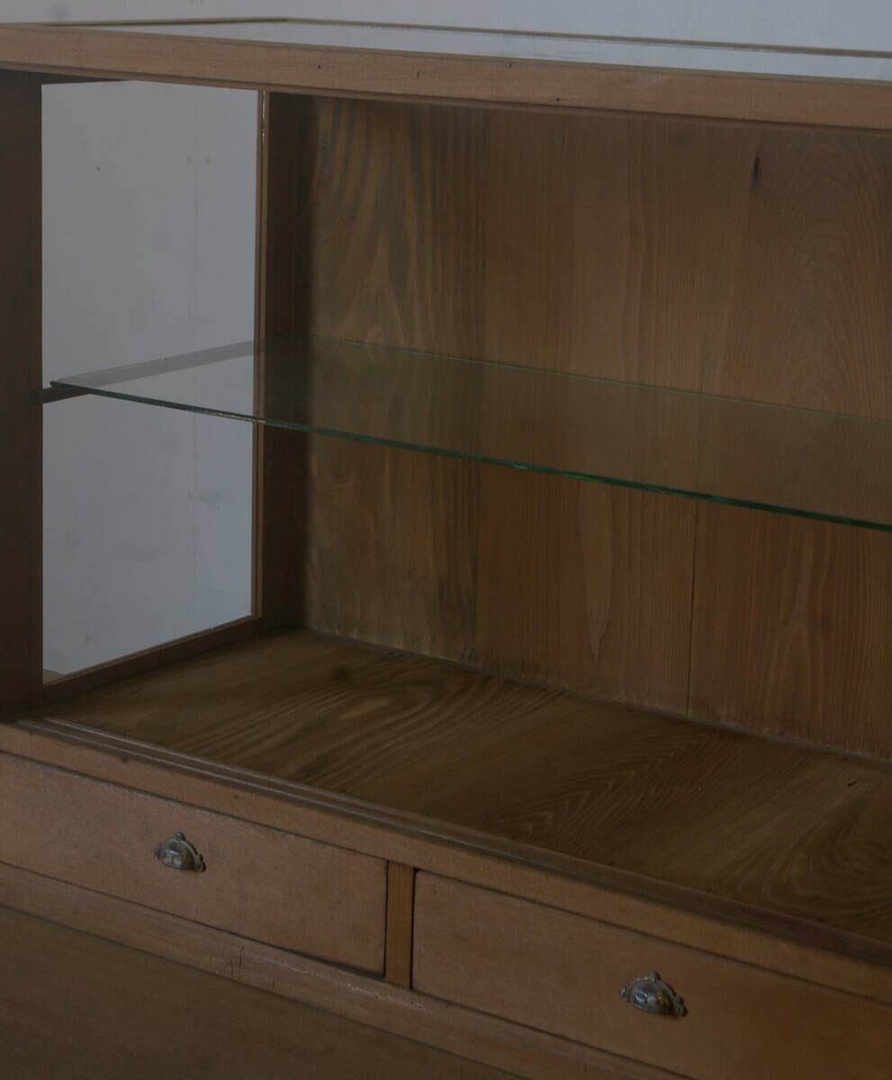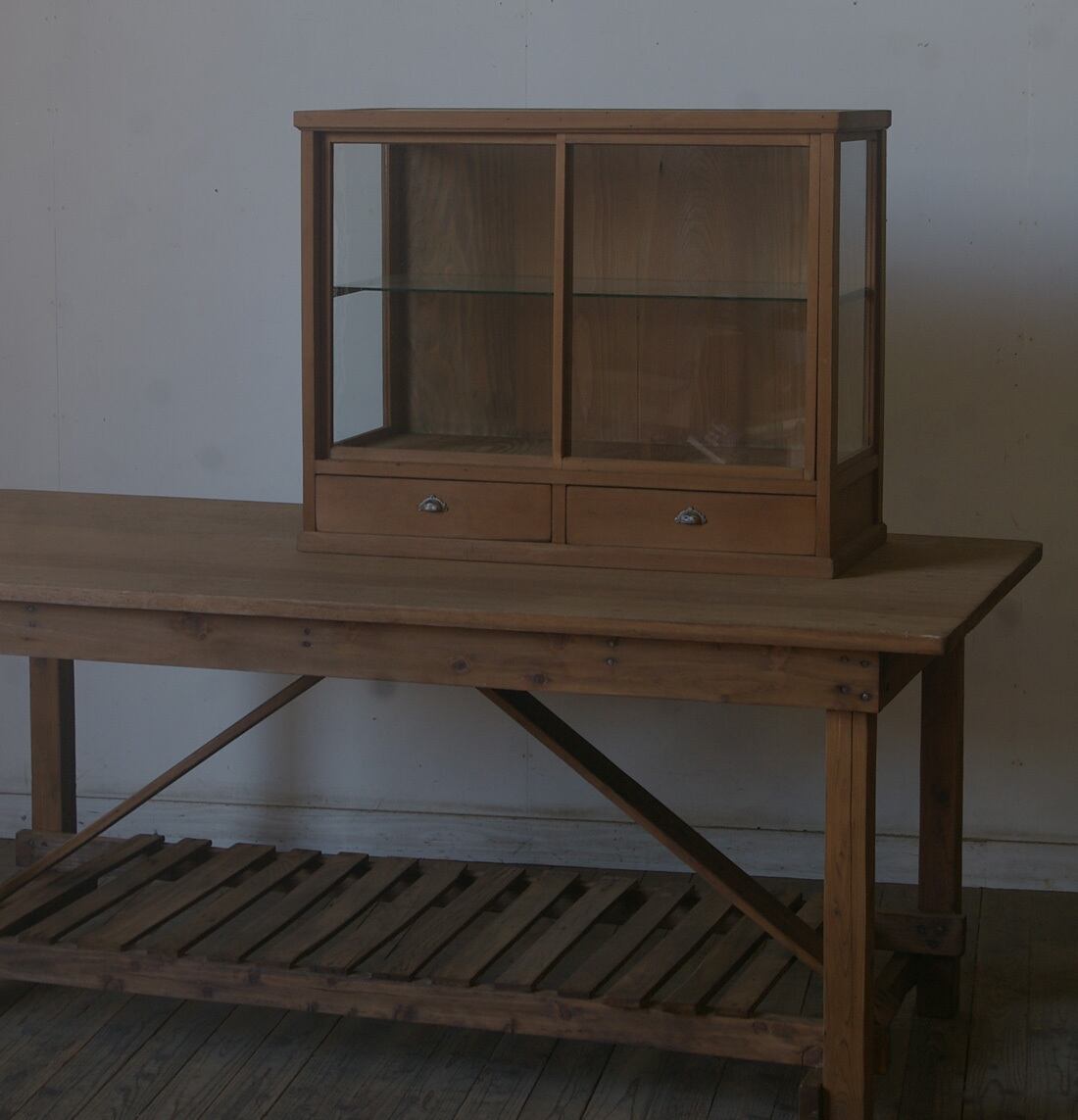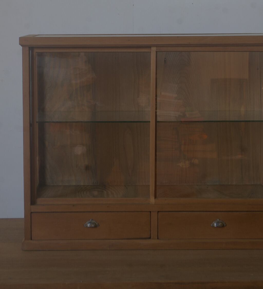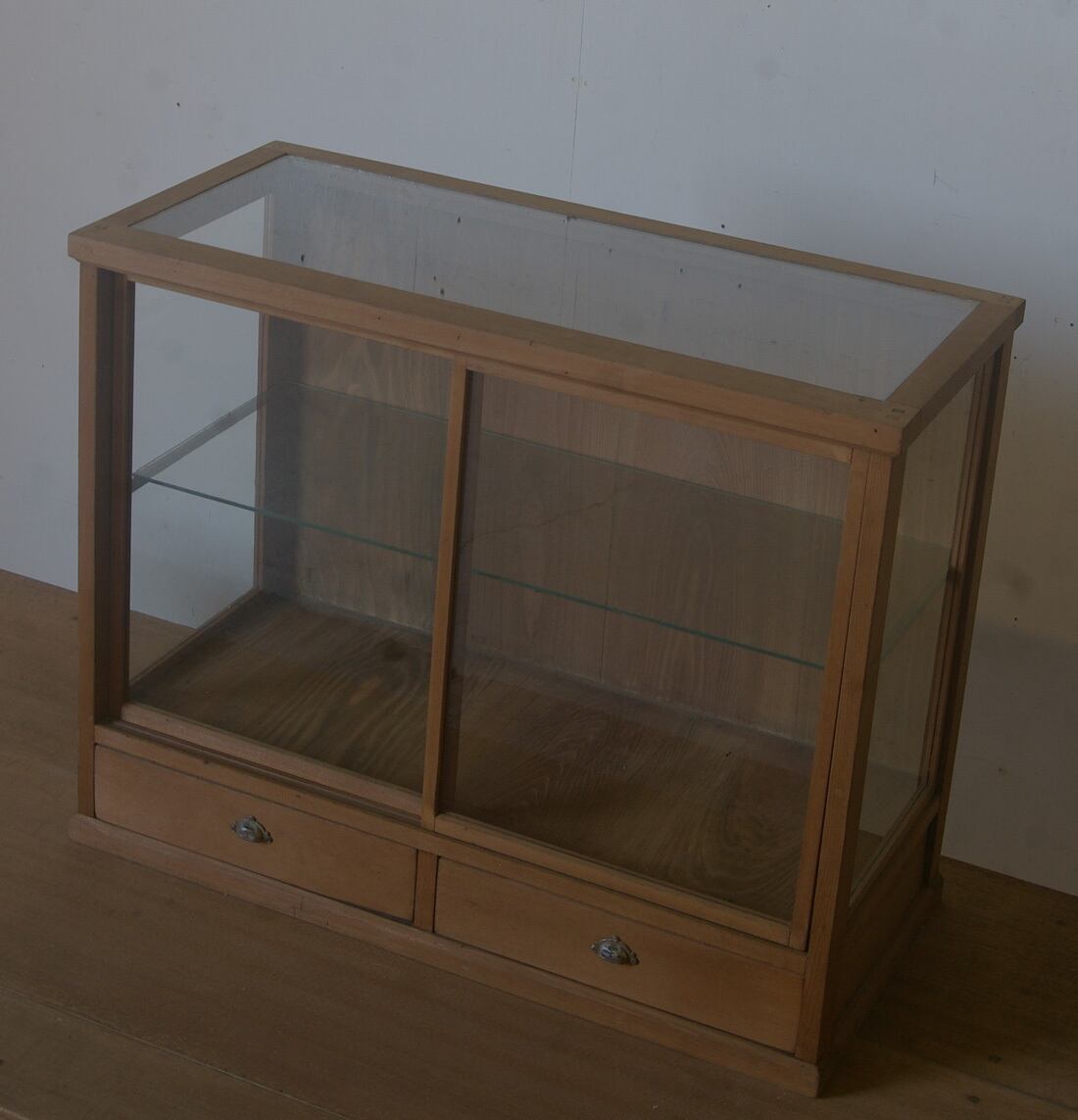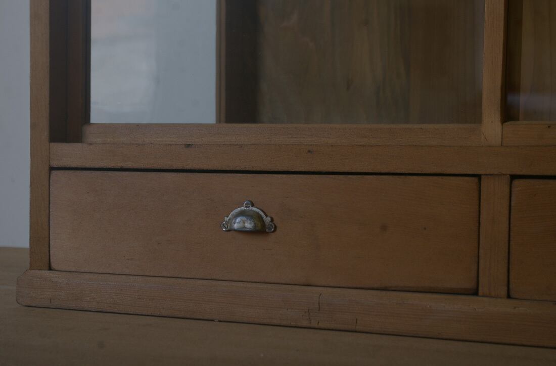 2枚のガラス戸と2杯の引き出し、古い木枠の綺麗な木目がとても雰囲気の良いアンティーク卓上ガラスショーケースです。