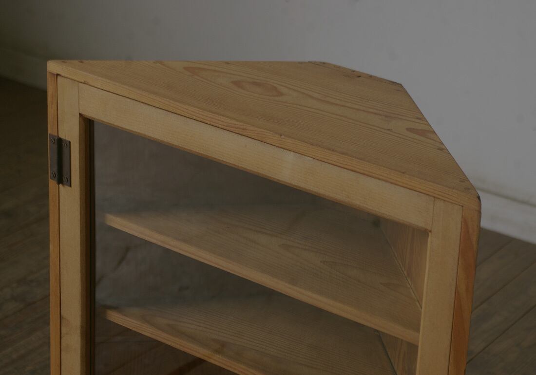 古い無垢材の綺麗な木目がとても雰囲気の良いアンティークコーナーキャビネットです。