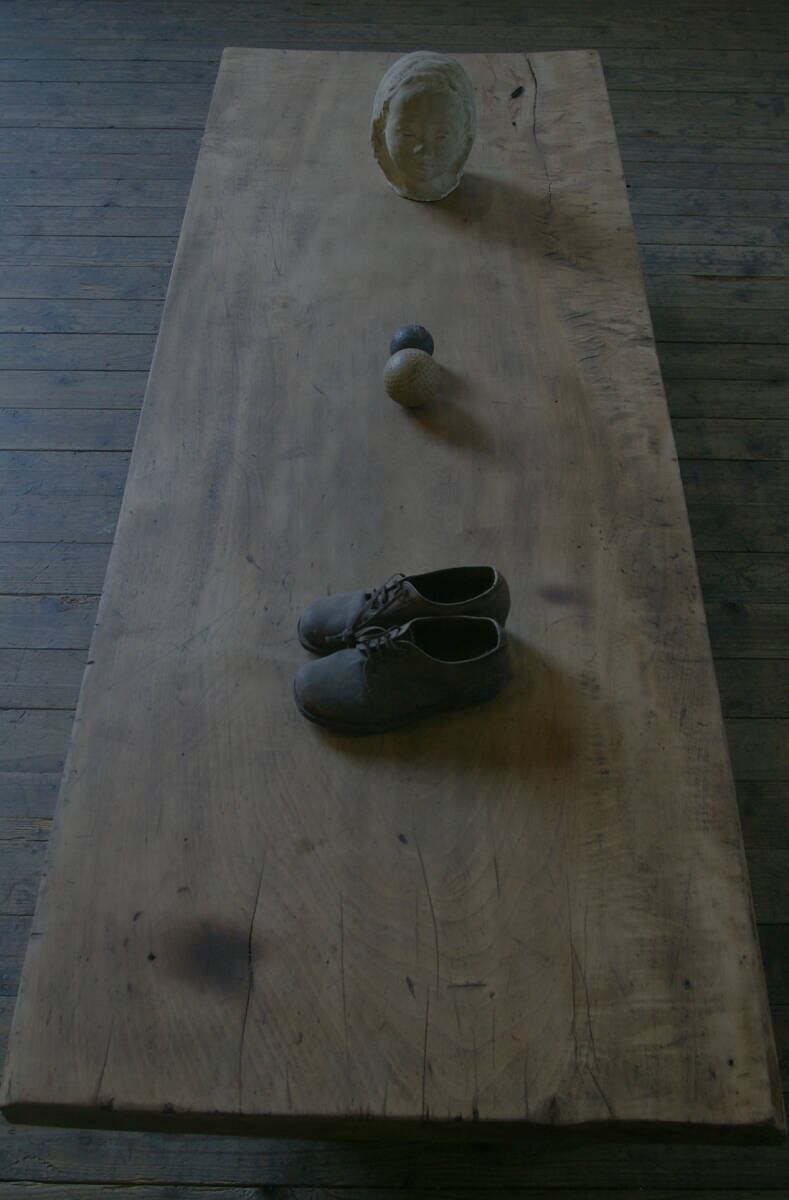 重厚な古い天板がとても存在感のあるアンティークローテーブルです。