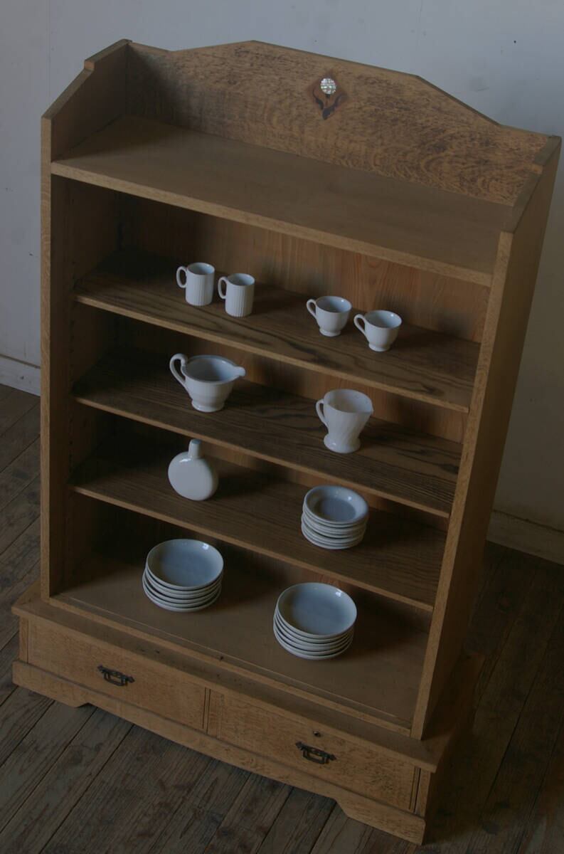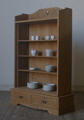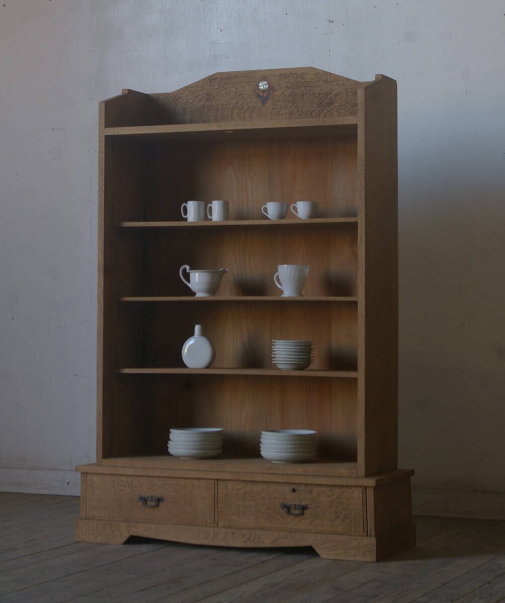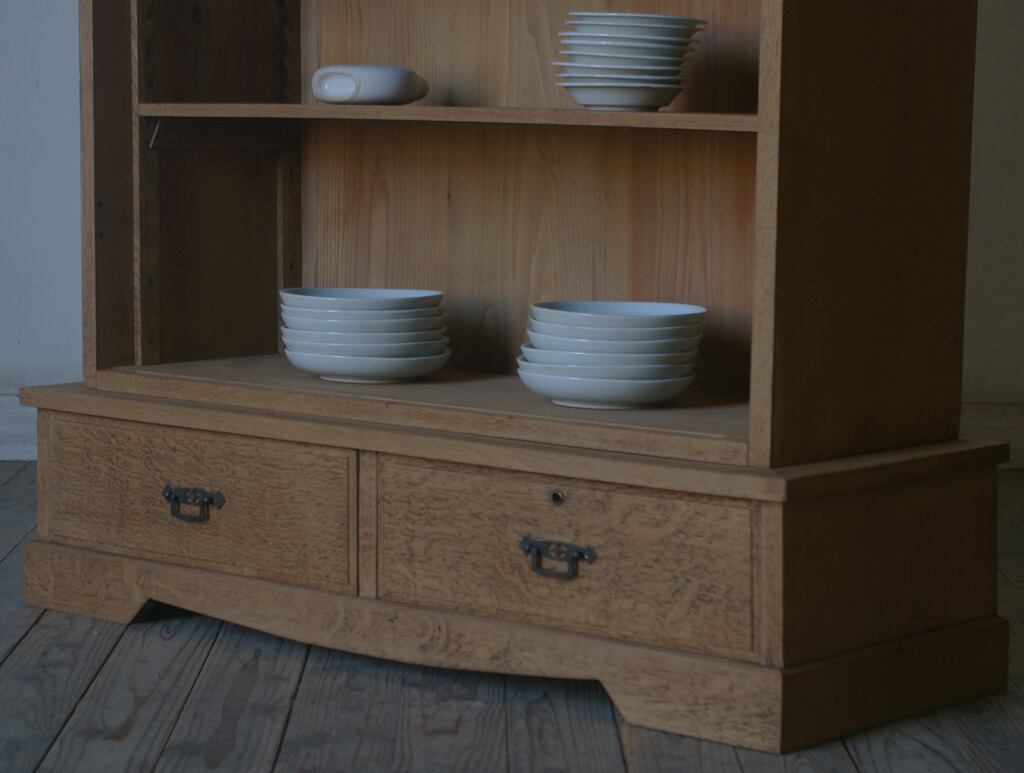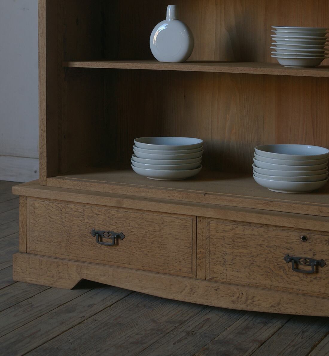 店舗やカフェ、ギャラリーなどでの什器としてやご自宅でのコレクションケースや食器棚、書庫などに棚部分、引き出し部分と分かれる重ねの造りになっております。