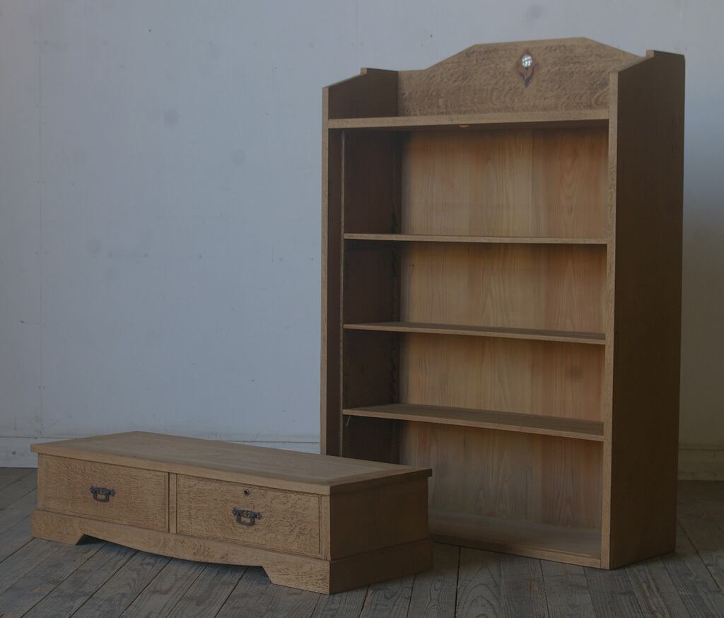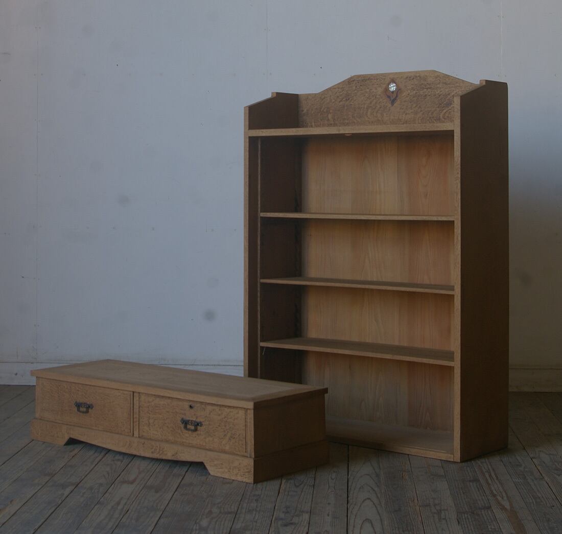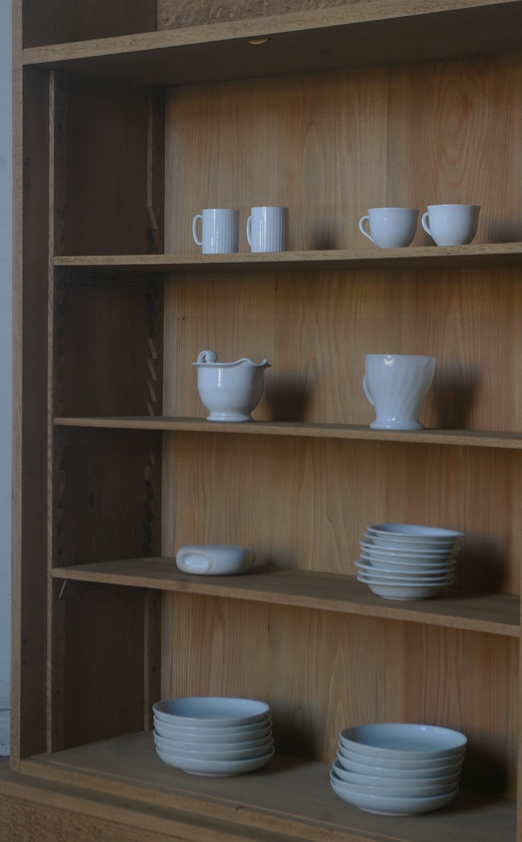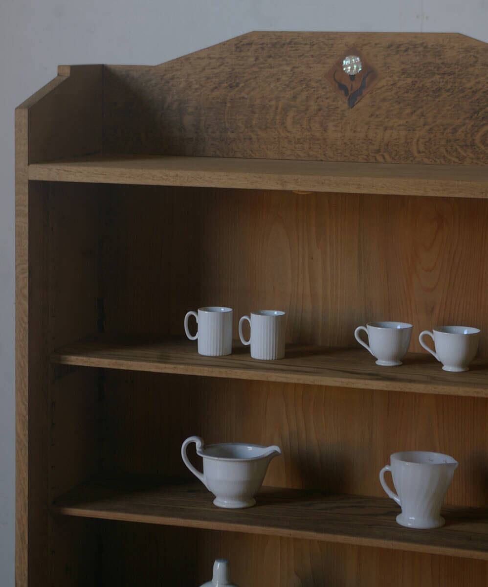 店舗やカフェ、ギャラリーなどでの什器としてやご自宅でのコレクションケースや食器棚、書庫などに棚部分、引き出し部分と分かれる重ねの造りになっております。