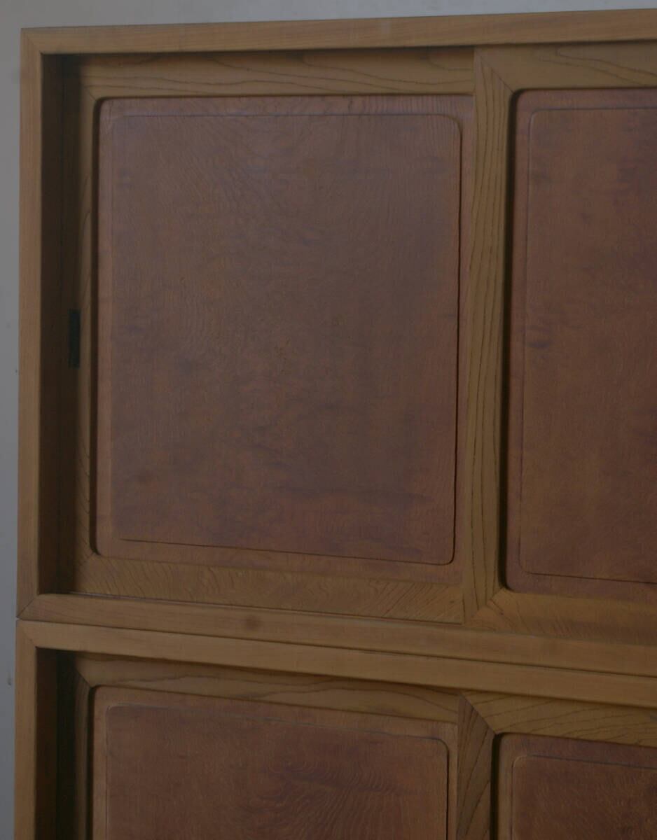 古い欅材の綺麗な木目がとても雰囲気の良いアンティーク重ね戸棚です。