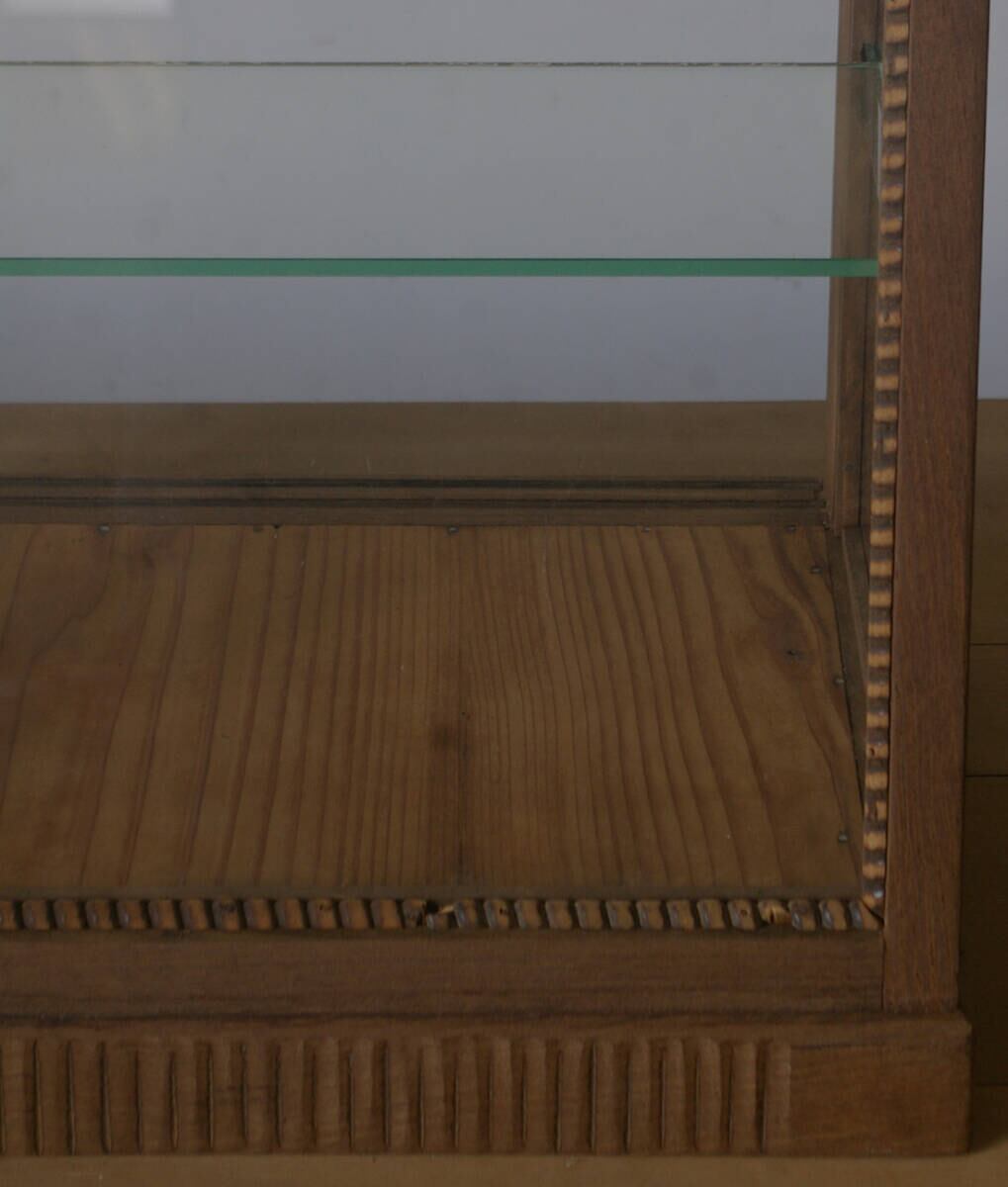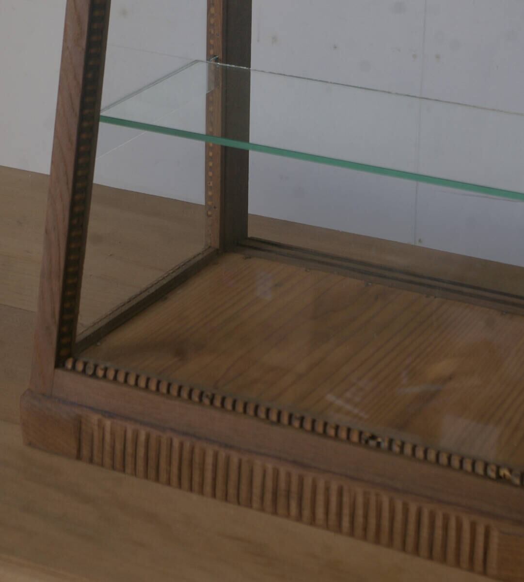 古い楢材枠の綺麗な木目がとても雰囲気の良いアンティーク前斜め卓上4面ガラスショーケースです。